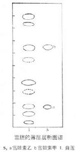 (4)薄层色谱取本品细粉2g,加已酸已酯10ml,浸泡过夜,滤过,作供试品溶液;另取雪胆素甲、雪胆素已制成对照品溶液。吸取二溶液点于同一硅胶G板上(120℃活化2h),用氯仿-丙酮-已酸已酯(4:3:1)展开,展距16cm,取出晾干后,喷10%磷钼酸已醇液显色,在120℃加热数分钟,供试品色谱中在与对照品色谱相应位置,均显蓝色斑点。