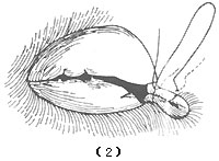 ② DeVega术,用带双头针的无创伤缝线沿前瓣和后瓣瓣环作双层交叉连续缝合,两端进出针处各带一垫片,收紧缝线结紥,以缩短扩大的后瓣和前瓣基部瓣环。
