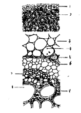 ⑵显微鉴别 叶柄横切面:类三角形,外侧为数列厚壁细胞。基本组织中有8-9个类圆形、环状排列的分体中柱;周韧型维管束。
