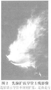 1.X线造影 导管腔呈中度至高度不规则的扩张,走行迂曲(图2),管壁光滑、完整、延续,少数呈囊状或梭状扩张。扩大的管腔内无占位征象,造影剂均匀地充盈管腔,可与乳癌区别。