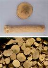 【制法】洗净,略泡,润透,切薄片,晒干。本品为圆形薄片,表面黄色或黄白色。木部宽广,导管孔大,多层环形排列呈筛网状,射线色浅,髓部不明显。周边灰黄色,粗糙。体轻,质硬。气微,味苦。
