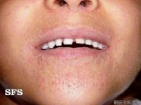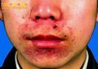 2、环绕口唇周围红斑,伴小丘疹、脓疱或脱屑
