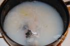 ②锅内放入清水,烧开后加入糯米,待再滚,改用文人熬煮至粥成,放入阿胶,淋火鸡蛋,候两三滚,再加入猪油境盐,搅匀即成。