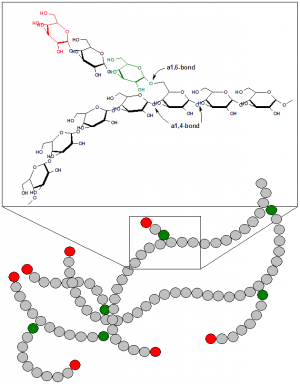 参见上图。在这个反应中,糖原磷酸化酶催化切断连接末端葡萄糖残基(图中红色的葡萄糖)的α[1→4]糖苷键。其化学反应实质是磷酸基的取代反应。这样,糖原链上末端的葡萄糖被依次磷酸化而成为游离分子而脱离糖原链,直至α[1→6]糖苷键(即糖原链的分支处,图中绿色所示)之前的第四个葡萄糖残基。此时,糖原脱分支酶催化将剩余四个葡萄糖残基中的前三个转移至另一糖原支链。被暴露的α[1→6]分支点可被α[1→6]葡萄糖苷酶催化水解,生成游离的葡萄糖分子。结果是移除了支链上最后一个葡萄糖残基,并消除了这个糖原支链。这个是仅有的例子,糖原分解的产物是葡萄糖,而非葡萄糖-1-磷酸。但是随后,这个葡萄糖分子将会通过己糖激酶的催化作用,再度磷酸化成为葡萄糖-1-磷酸。葡萄糖-1-磷酸继而通过磷酸葡萄糖异构酶的催化,转化成为葡萄糖-6-磷酸