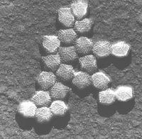 腺病毒(adenovirus)是一种没有包膜的直径为70~90 nm的颗粒,由252个壳粒呈廿面体排列构成。每个壳粒的直径为7~9 nm。衣壳里是线状双链DNA分子,约含35 000 bp,两端各有长约100 bp的反向重复序列。由于每条DNA链的5'端同相对分子质量为55X103Da的蛋白质分子共价结合,可以出现双链DNA的环状结构。