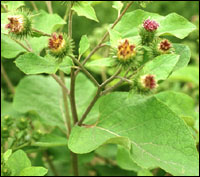 牛蒡 二年生草本,高1-2m。根粗壮,肉质,圆锥形。茎直立,上部多分枝,带紫褐色,有纵条棱。基生叶大形,丛生,有长柄;茎生叶互生;叶片长卵形或广卵形,长20-50cm,宽15-40cm。先端钝,具刺尖,基部常为心形,全缘或具不整齐波状微齿,上面绿色或暗绿色。具疏毛,下面密被灰白色短绒毛。头状花序簇生于茎顶或排列成伞房状,直径2-4cm,花序梗长3-7cm,表面有浅沟,密被细毛;总苞球形,苞片多数,覆瓦状排列,披针形或线状披针形,先端钩曲;花小,红紫色,均为管状花,两性,花冠先端5浅裂,聚药雄蕊5,与花冠裂片互生,花药黄色;子房下位,1室,先端圆盘状,着生短刚毛关冠毛;花柱细长,柱头2裂。瘦果长圆形或长圆状倒卵形,灰褐色,具纵棱,冠毛短刺状,淡黄棕色。花期6-8月,果期8-10月。